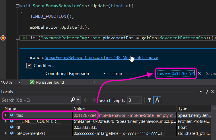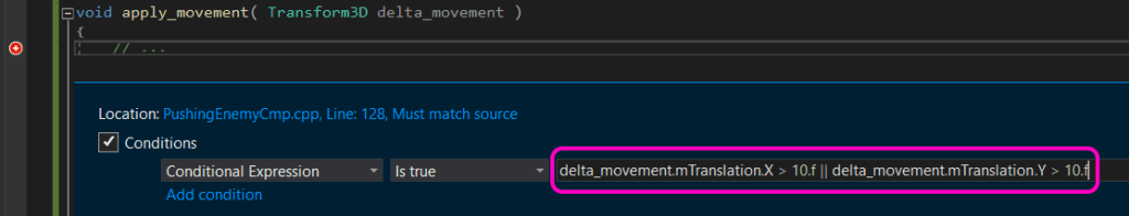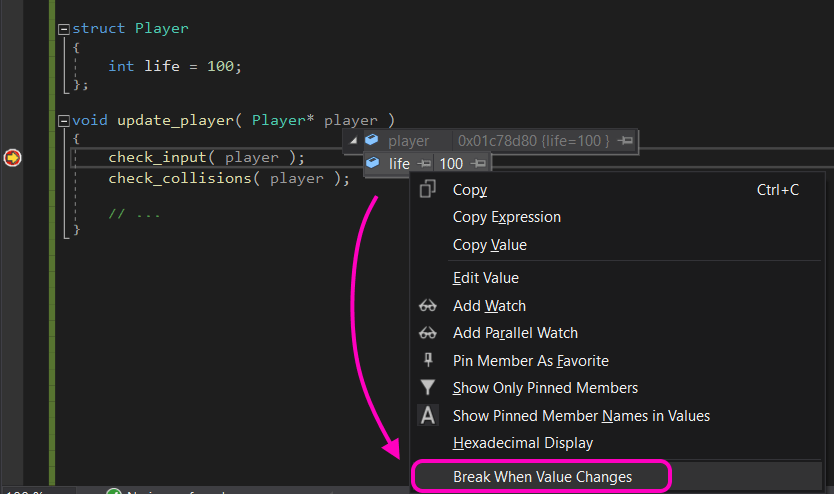 This is very useful when you don’t know where a value comes from, in this case I stop the execution in the last place where the “correct” value is set or just after the variable is created and enable the data breakpoint in it, then I press F5 (continue execution) and Voila! The program is stopped exactly in the code that is changing the variable.