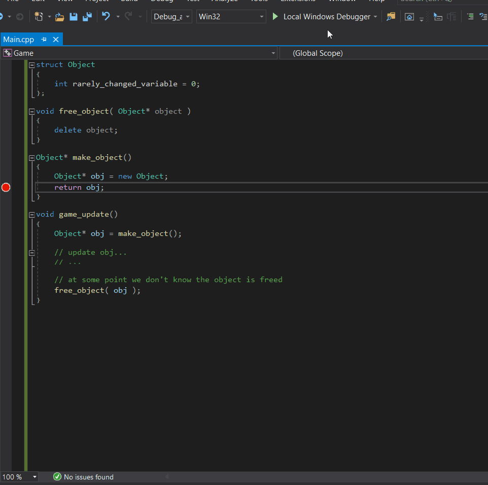 Here’s a sample code, imagine that we don’t know where the deletion of the object happens, that’s the line we want to find using a data breakpoint: