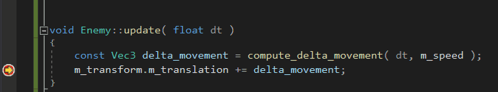 Note that the function compute_delta_movement takes the speed parameter and that the delta movement is applied in the update function, instead of creating a function update_movement that would do everything: read the speed parameter, compute the delta and apply it to the translation variable.